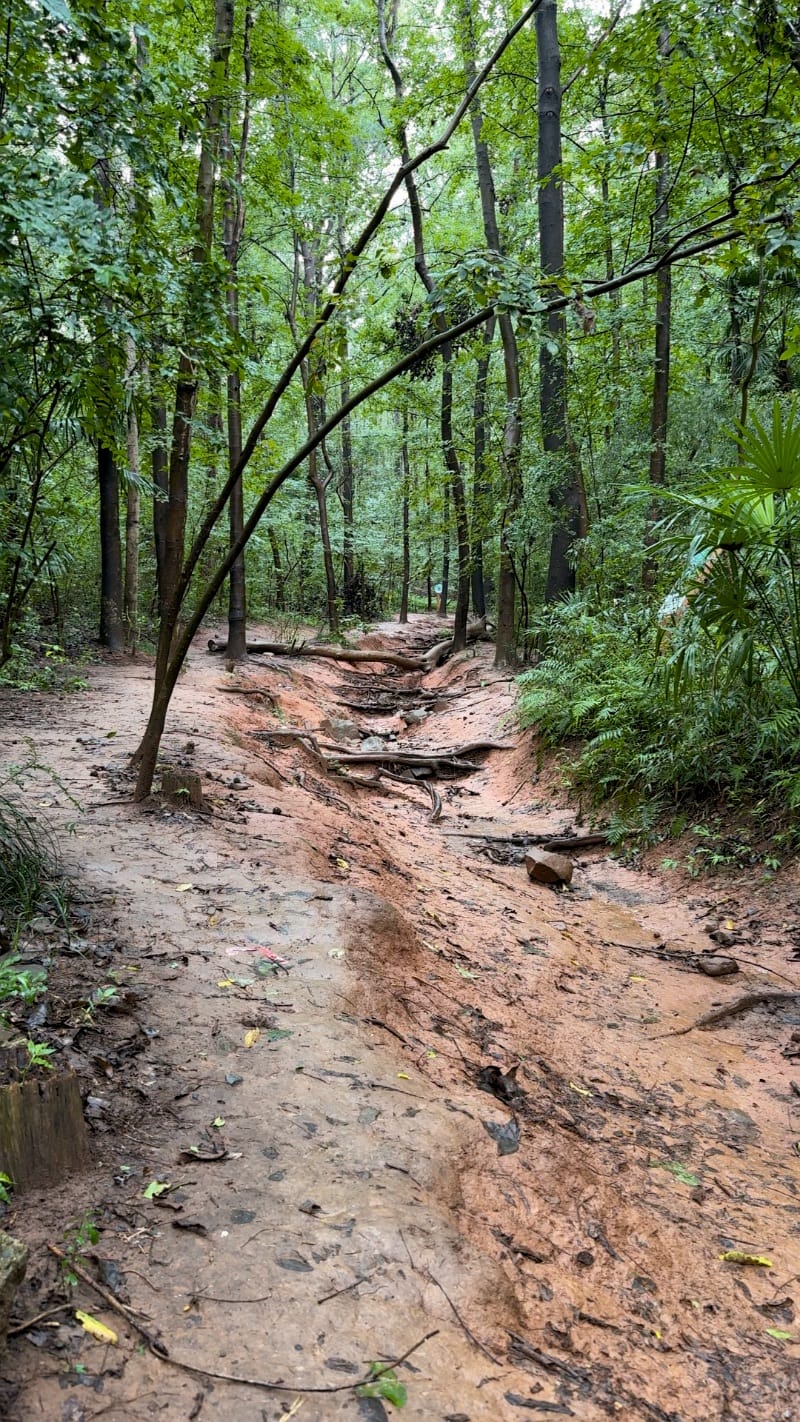 一进入山道,就被几百只蝉、鸟、虫的鸣叫声,以及雨水打在叶子上的哒哒声所围绕,此起彼伏,或近或远。8 月树木相当丰茂,加上刚下完雨,竟有一种徒步热带雨林的错觉(但我并没有见过真正的热带雨林)。这里也确实是在合肥能找到近且原始的山林小道了。